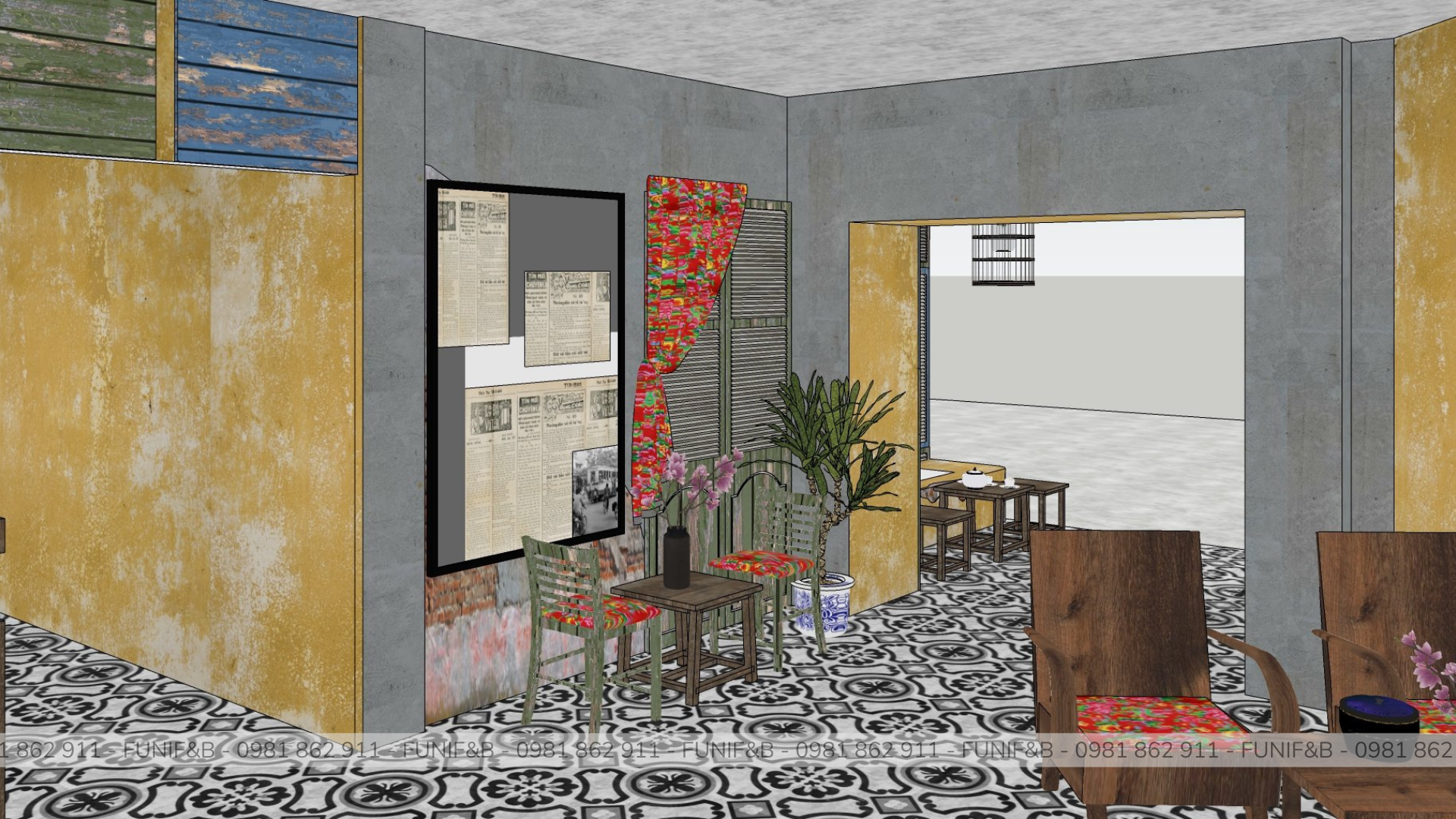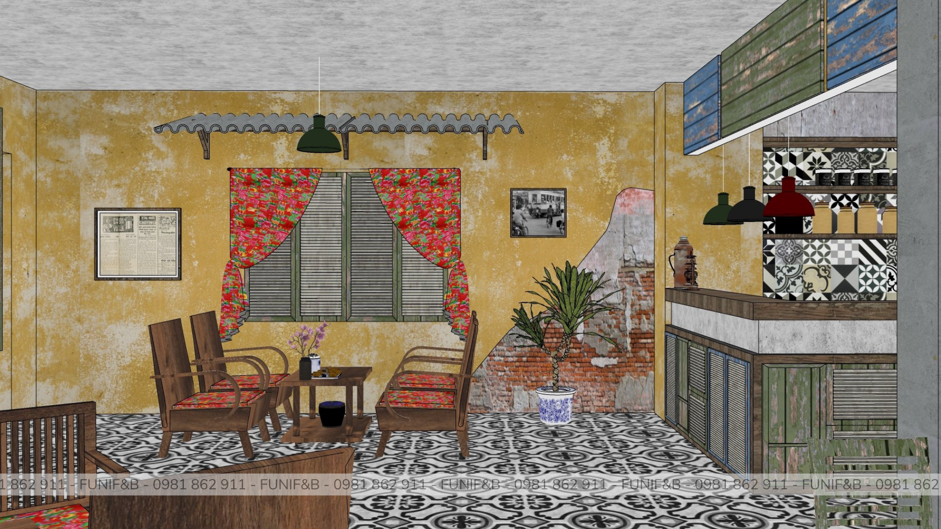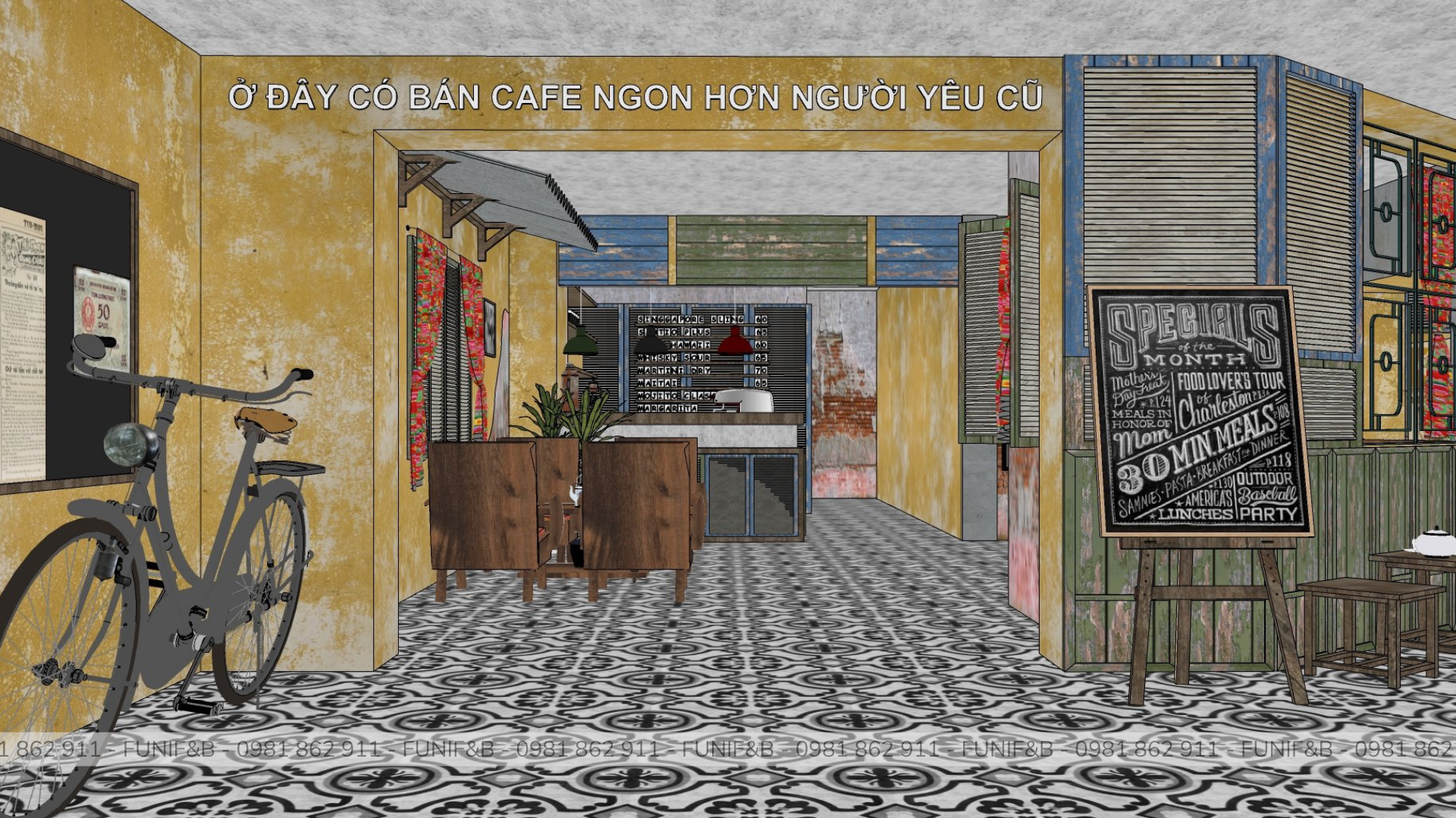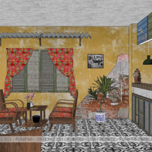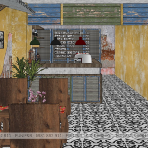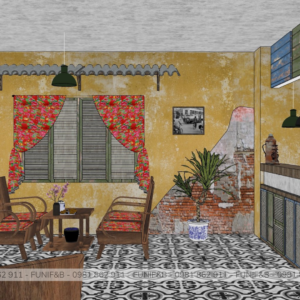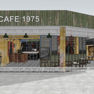 Quán được thiết kế theo phong cách Vintage mang xu hướng hoài niệm rất phù hợp với đối tượng khách hàng mà anh chủ mong muốn. Quán có một ưu thế rất đặc biệt là có 3 mặt tiền, không gian bên trong quán rất rộng rãi và thoáng mát thích hợp cho việc tán gẫu cho những giờ làm việc mệt mỏi. Lạ và độc đáo mà những gì mà FUNI tạo nên cho dự án này.